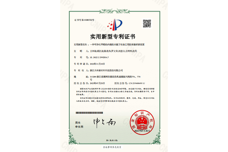 一種可凈化甲醛的內(nèi)墻防水膩子粉加工用防堵塞研磨裝置-證書